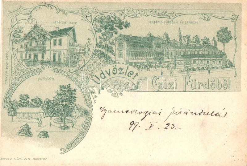 1899 Csízfürdő, Kúpele Ciz; Nedeczky telep, vendéglő, fürdőház és lakházak, pavilon. Márkus D. műintézete és Fogel Mór / villa, restaurant, spa, pavilion. Art Nouveau, floral (vágott / cut)