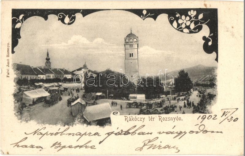1902 Rozsnyó, Roznava; Rákóczi tér, torony. Falvi Jenő kiadása / square with tower, Art Nouveau