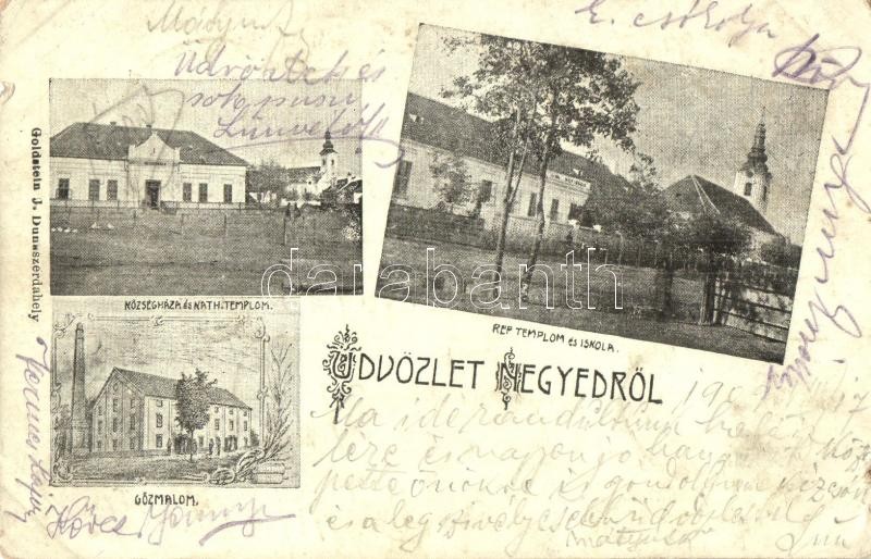 Description: 1909 Negyed, Neded; Református templom és iskola, Katolikus templom, községháza, gőzmalom. Goldstein J. kiadása / town hall, churches, school, mill (ázott sarok / wet corner)