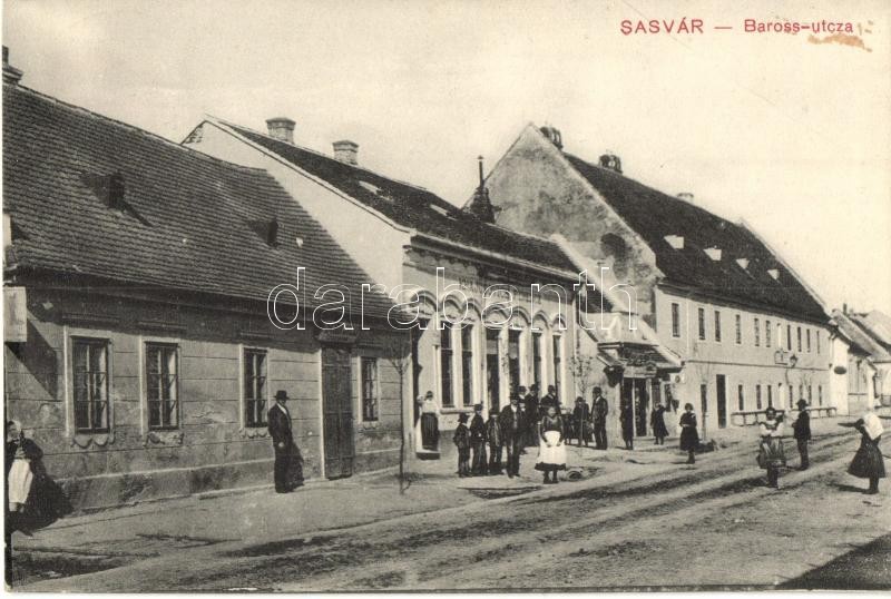 Description: 1916 Sasvár, Sastín, Mária Sasvár, Maria-Schlossberg; Baross utca, Fischer Jakab üzlete, Krajcsovics Ferenc üzlete és saját kiadása / street view with shops (EK)