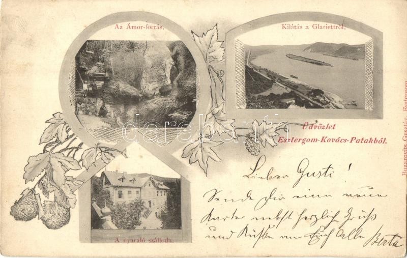 Kovácspatak, Kovacov (Esztergom); Ámor forrás, Kilátás a Glariettről, Nyaraló szálloda, villa. Buzarovits Gusztáv kiadása / thermal spring, spa hotel, villa. Art Nouveau, floral (EK)