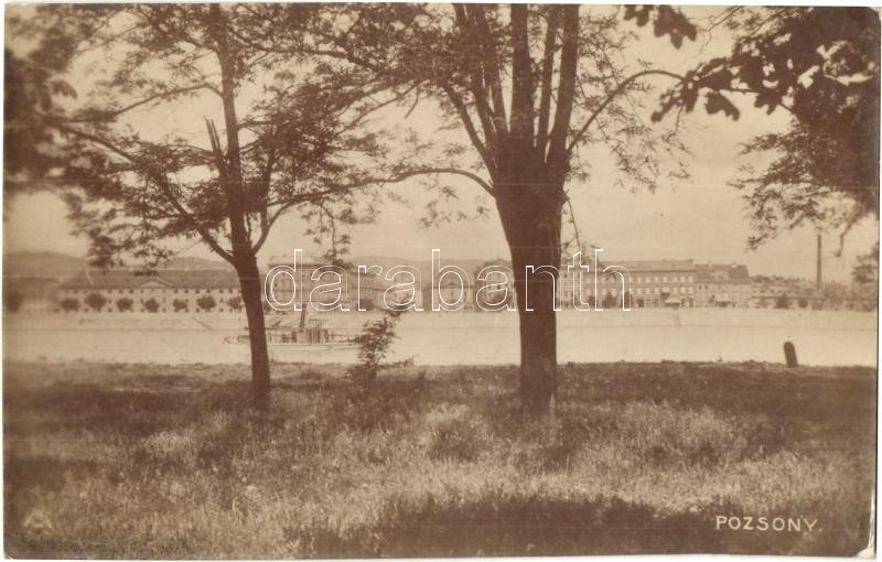 Pozsony, Pressburg, Bratislava; látkép, üzletek, gőzhajó / general view, shops, steamship (EK)
