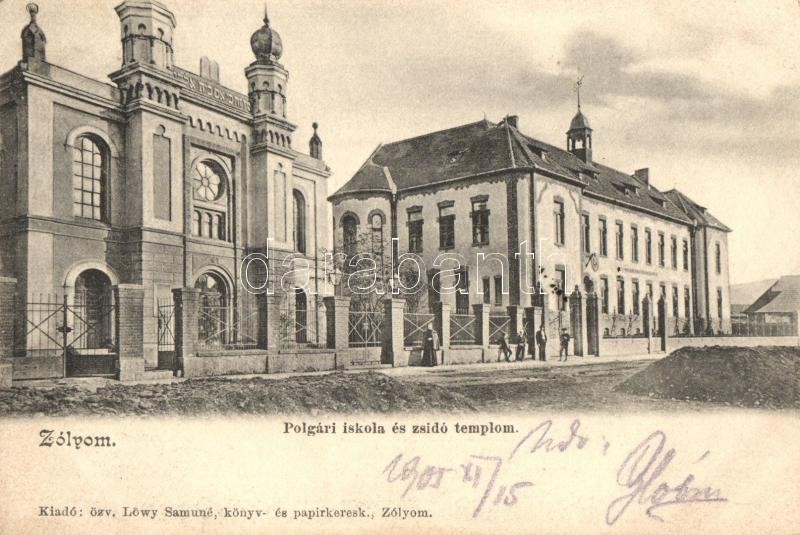 Zólyom, Zvolen; Polgári iskola és zsidó templom, Zsinagóga. Kiadó: Özv. Löwy Samuné / school, synagogue