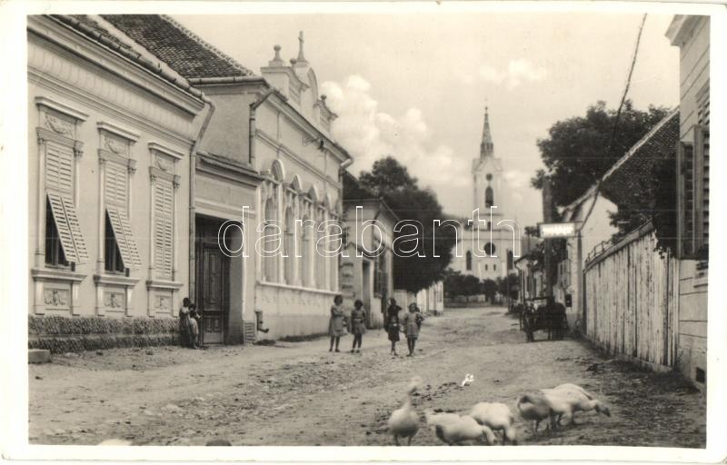 1942 Szépvíz, Csíkszépvíz, Furomoasa; Templom utca / street view with church