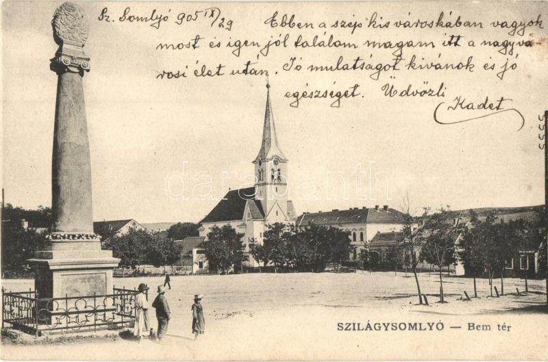 Description: Szilágysomlyó, Simleu Silvaniei; Bem tér, Görögkatolikus templom és iskola. Veres Károly kiadása / square, Greek Catholic church and school, monument (EK)