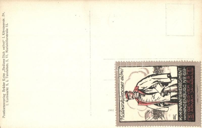 1909 Az SMS Radetzky Osztrák-Magyar Haditengerészet Radetzky-osztályú pre-dreadnought csatahajójának vízre bocsátási ünnepsége / K.u.K. Kriegsmarine Stapellauf "Radetzky". Brüder Kohn "Bediene Dich selbst" / Austro-Hungarian Navy ship launching ceremony + Hatvankilenczes előre! K.u.K. Infanterieregiment von Hindenburg No. 69. bélyeg