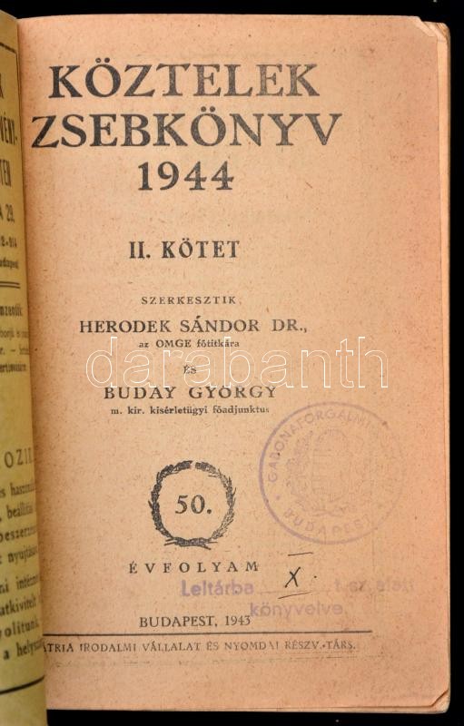 https://www.darabanth.com/en/326-Online-auction/326.0/Books/Books-Law~1500004/Koztelek-zsebkonyv-1944-II-kotet-Szerk-Dr-Herodek-Sandor-es-Buday-Gyorgy-50-evf-Bp-~II1778457
