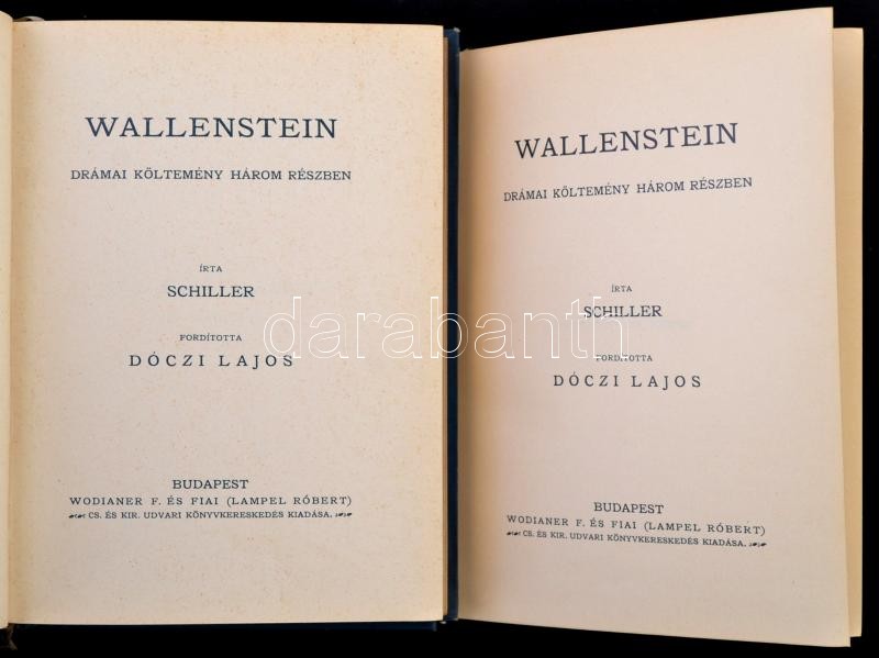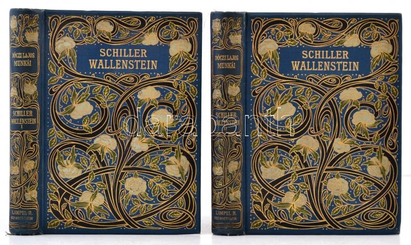 Dóczi Lajos munkái VIII-IX. kötet: Schiller: Wallenstein. II. kötet. Drámai költemény három részben. Fordította: Dóczi Lajos. Bp., én., Lampel R. (Wodianer F. és Fiai.), Hornyánszky Viktor-ny. Kiadói aranyozott, festett, illusztrált egészvászon-kötés, Gottermayer-kötés, aranyozott lapélekkel, jó állapotban.