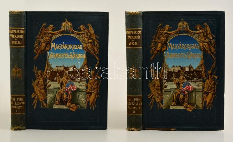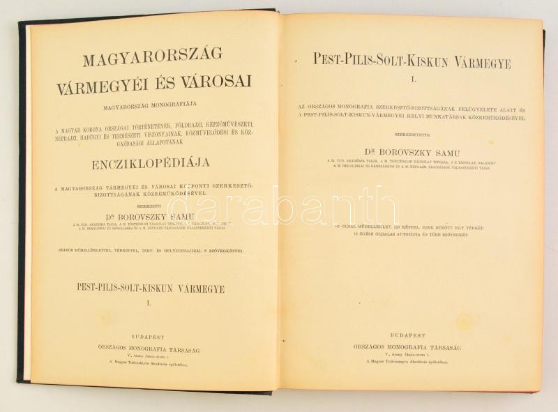 Pest-Pilis-Solt-Kiskun vármegye I-II. kötet. Szerk.: Dr. Borovszky Samu. Magyarország vármegyéi és városai. Magyarország monográfiája. Bp.,(1910), Országos Monográfia Társaság, (Légrády-ny.),XII p.+1 t.+491 p.+6+577 p. Kiadói aranyozott, festett egészvászon-kötés, Gottermayer-kötés, festett lapélekkel, kissé kopott borítóval, a II. kötet borítója némileg sérült, kissé sérült gerinccel.