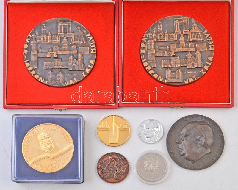 Description: 8db-os vegyes emlékérem és zseton tétel, közte Renner Kálmán (1927-1994) 1972. "Győr-Sopron, Vas, Zala Megye / Nyugat-Dunántúli Intéző Bizottság" Br emlékérem tokban T:2