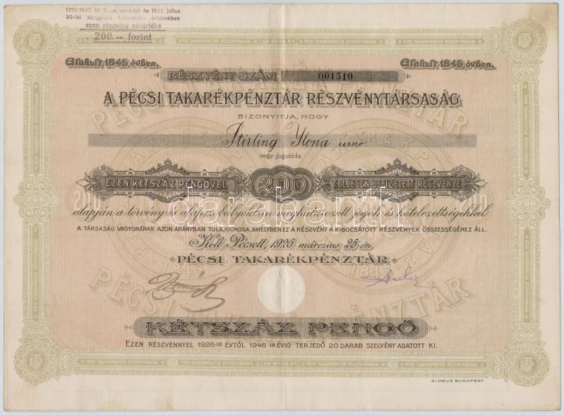 https://www.darabanth.com/en/326-Online-auction/326.0/Numismatics/Shares-and-Tickets~2000005/Pecs-1926-Pecsi-Takarekpenztar-Reszvenytarsasag-nevre-szolo-reszvenye-200P-rol-sz~II1815779