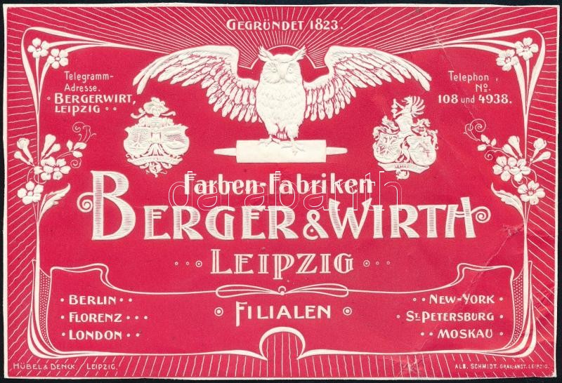 Berger & Wirth Farben-Fabriken Leipzig dombornyomott reklámcédula,...