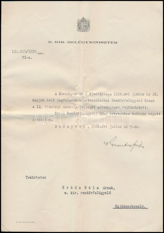 1938 Keresztes-Fischer Ferenc (1881-1948) belügyminiszter saját kézzel...