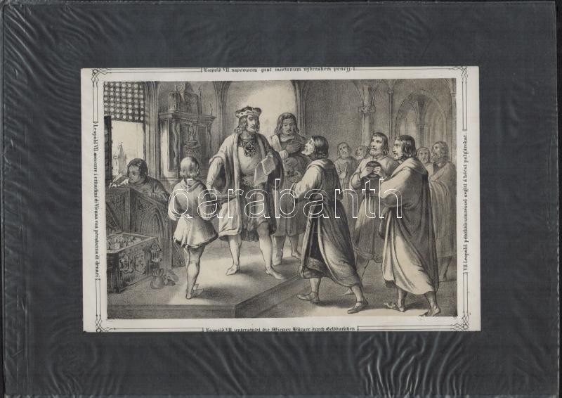 Description: 2 db történelmi tárgyú litográfia (Das Wiener Freiwilligen Aufgebaut, VII. Leopold pénzkölcsönnel segíti a bécsi polgárokat) Litográfia, papír, paszpartuban, 17x25 cm.