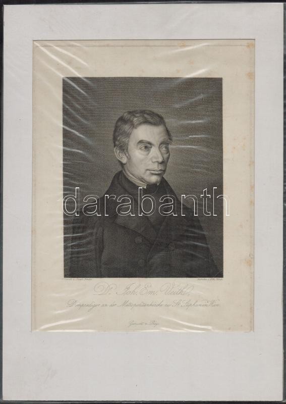 cca 1850 Joseph Binder (1805-1863)-Alois Petrak (1811-1888): Johann Emanuel Veith. Domprediger an der Metropolitankirche zu St. Stephan in Wien. Papír, acélmetszet, paszpartuban, 17x14 cm. Johann Emanuel Veith (1787-1876) a bécsi Szent István bazilika papja (1831-45), hitszónok, orvos, költő./ cca 1850 Joseph Binder (1805-1863)-Alois Petrak (1811-1888): Johann Emanuel Veith. Domprediger an der Metropolitankirche zu St. Stephan in Wien. Paper, steel engraving, in paspartu, 17x14 cm.