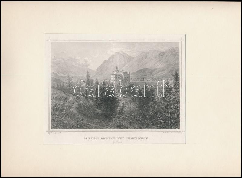 cca 1850 Julius Lange (1817-1878) - Franz Hablitschek (1824-1867): Schloss Ambras bei Innsbruck (Tyrol), papír, acélmetszet, paszpartuban, 10x15 cm./ cca 1850 Julius Lange (1817-1878) - Franz Hablitschek (1824-1867): Schloss Ambras bei Innsbruck (Tyrol), paper, steel engraving, in paspartu,10x15 cm.