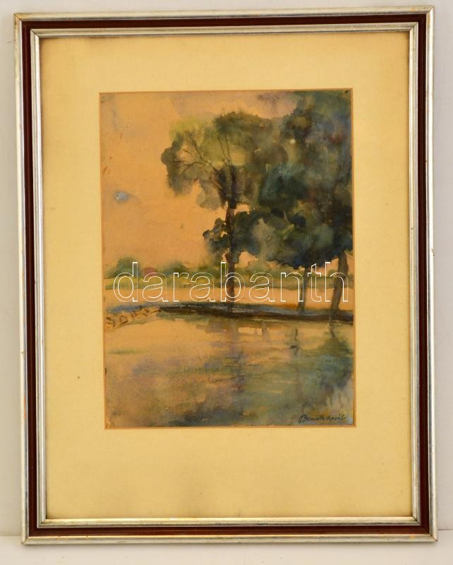 Bernáth jelzéssel: Folyó part. Akvarell, papír, üvegezett keretben, 28...
