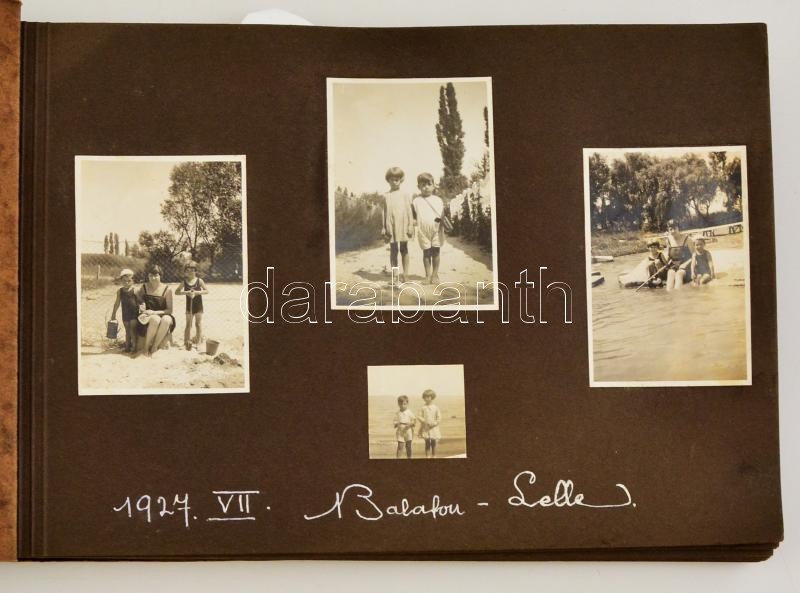 1927-1932 Balatoni életképek, fényképek számos helyszínről: Balatonlelle, Balatonszemes, Balatonaliga, Balatonkenese, Keszthely, Bélatelep, Balatonőszöd, Sashegy, feliratozva, albumba rendezve, összesen 81 db, különböző méretben