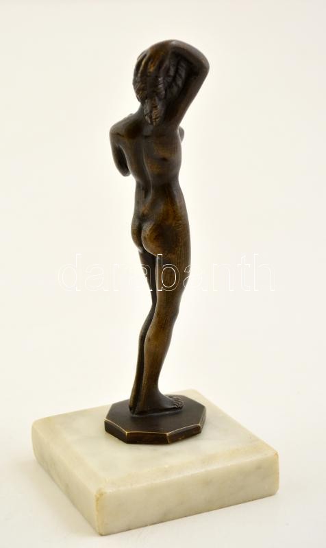Női akt, kisméretű bronz szobor, alabástrom talapzaton, m: 18,5 cm