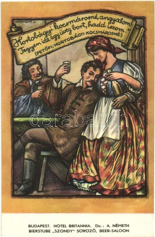 Budapest VI. Hotel Britannia, Szondy söröző, Petőfi Hortobágyi Kocsmárosné verse s: Haranghy J.