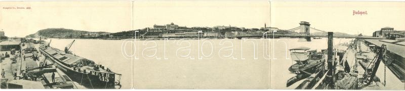 1898 Budapest, Duna és Lánchíd, rakpart, MFTR és DDSG uszályok. Három-lapos panorámalap / three-tiled panoramacard