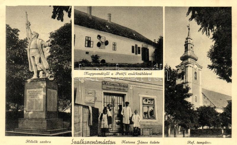 1939 Szalkszentmárton, Református templom, Hősök szobra, Nagyvendéglő a Petőfi emléktáblával, Katona János üzlete és saját kiadása
