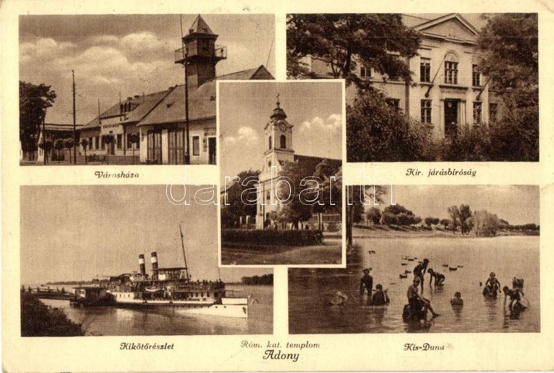 Adony, Városháza, Kir. Járásbíróság, Római katolikus templom, Kis-Duna, fürdőzők, Kikötő gőzhajóval (EK)