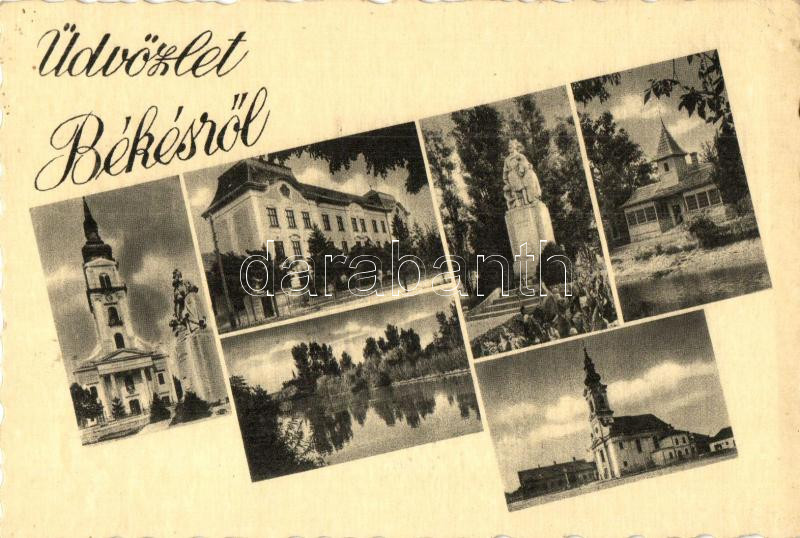 Békés, Hősök szobra, gimnázium, templomok (EK)