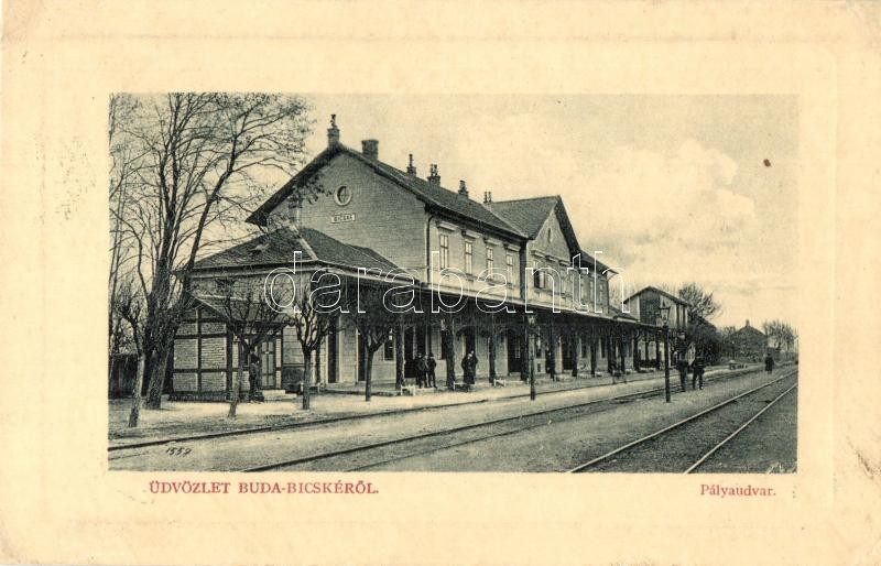 Bicske, Buda-Bicske; Vasútállomás, pályaudvar. W. L. Bp. 96. Kiadja Lichtenstein Mór (megerősített sarkak / restored corners)
