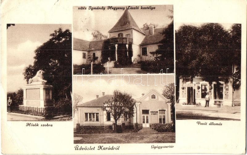 Karád, Hősök szobra, Gyógyszertár, Vasútállomás, Vitéz Igmándy Hegyessy László kastélya. Falus foto (EK)