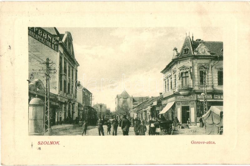 Szolnok, Gorove utca, Népbank és Takarékpénztár rt., Steiner Jakab fiai, Szentes Adolf, Scheibel Tamás üzlete, piaci árusok. W. L. Bp. 6510. (EK)