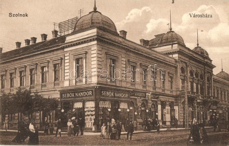 Szolnok, városháza, utcakép, Sebők Nándor, Koppán György és Konsitzky György üzlete