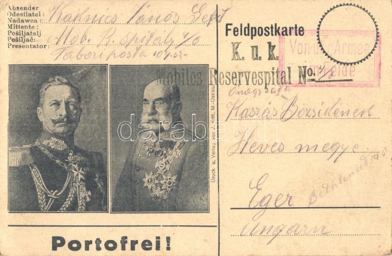 Description: 1915 II. Vilmos német császár, Ferenc József, Viribus Unitis. Tábori postai levelezőlap / WWI Wilhelm II, Franz Joseph; Austro-Hungarian K.u.K. military field post + Mobiles Reservespital No. 4/8 (EK)