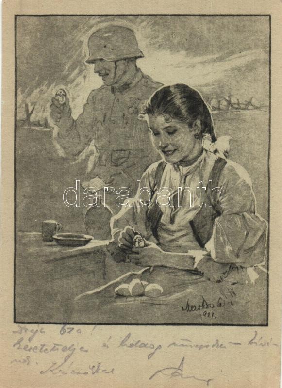 Description: 1944 Húsvéti üdvözlet. Kiadja a M. Kir. Honvéd Haditudósító Osztály Parancsnoksága. Tábori Postai Levelezőlap / WWII Hungarian military field post, Easter greeting. s: Markó Lajos
