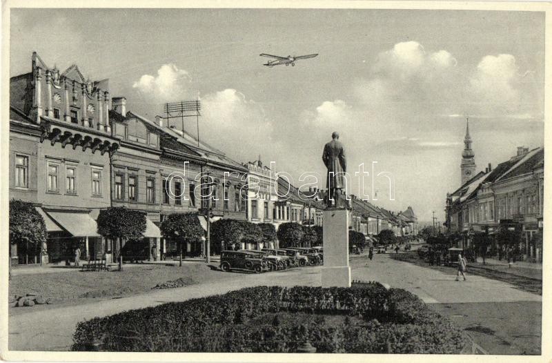 Eperjes, Presov; Masaryk utca és szobor, repülőgép, autók / street and...