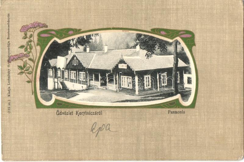 Description: Koritnyica, Korytnica; Pannonia szálloda és étterem. Kiadja Lechnitzky O. 115. sz. / villa, hotel and restaurant. Art Nouveau, floral, litho frame (EK)