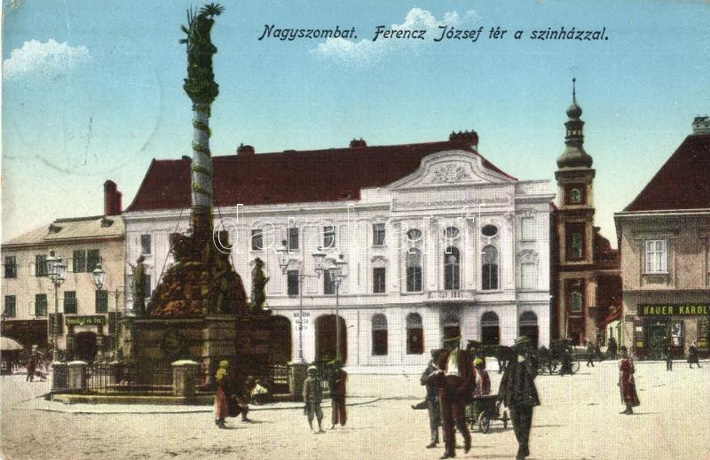 Nagyszombat, Tyrnau, Trnava; Ferenc József tér, színház, Szentháromság... https://www.darabanth.com/en/326-Online-auction/326.0/Postcards/Slovakia~2500007/Nagyszombat-Tyrnau-Trnava-Ferenc-Jozsef-ter-szinhaz-Szentharomsag-szobor-Bauer-Karoly-C3~II1816368