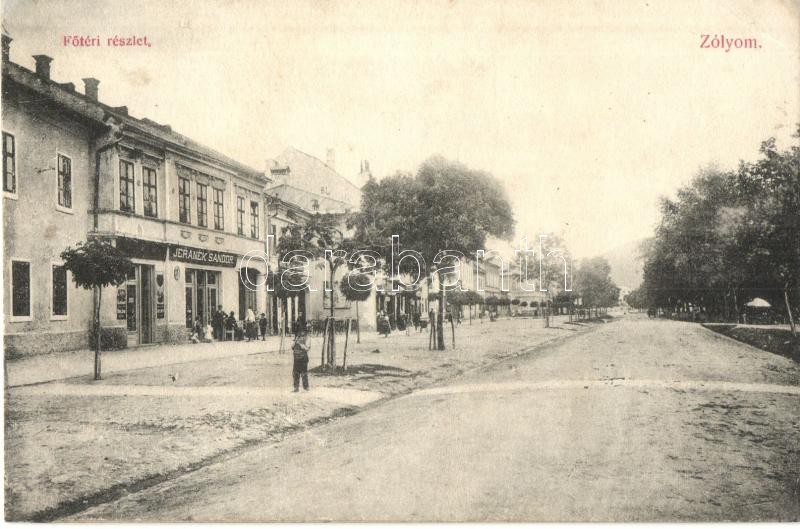 Zólyom, Zvolen; Fő tér, Jeranek Sándor üzlete / main square, shops (r)