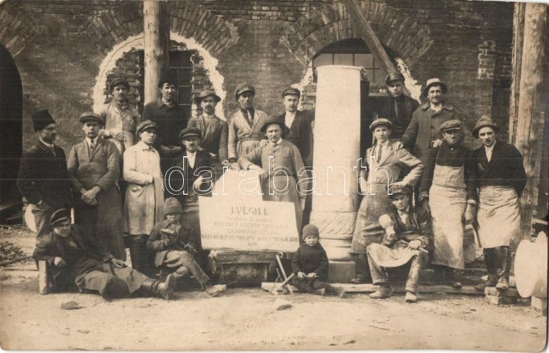Description: 1926 Kolozsvár, Cluj; J. Végh, "Sculptor de piatra, Ridicarea bisericii catedrala lucrarea de pietrari" / A kolozsvári katedrális templom munkálatai 1926-ban, Végh J. kőműves és munkásai / Cathedral church under construction, stonemasons, workers. photo (EK)