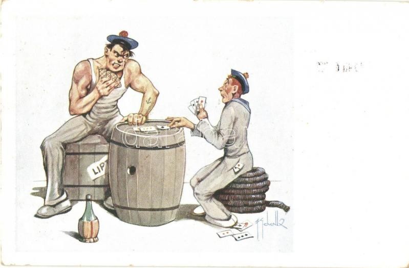 Czech mariners playing card game. humour art postcard. Hospodárské pomoci s: F. Schenk