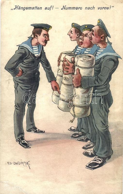 Hängematten auf! / Nummero nach vorne / K.u.K. Kriegsmarine mariners humour art postcard. C. Fano 8. 1914/15. + K.u.K. Kriegsmarine Tegetthoff s: Ed. Dworak (EK)
