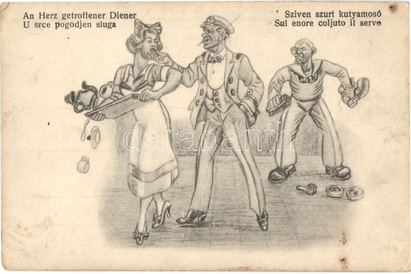 Description: Szíven szúrt kutyamosó / An Herz getroffener Diener / U srce pogodjen sluga / Sul enore coljuto il serve / K.u.K. Kriegsmarine mariners art postcard. G. Fano 2007. 1917. unsigned Ed Dworak
