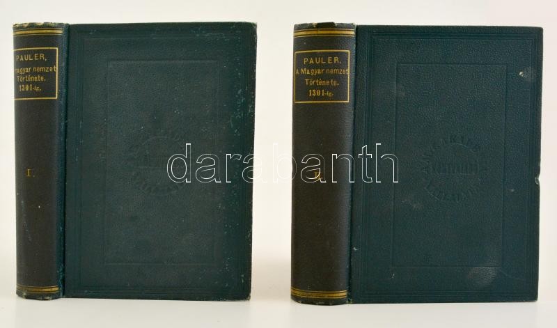 Pauler Gyula: A magyar nemzet története az Árpádházi királyok alatt. I-II. kötet. Magyar Tudományos Akadémia Könyvkiadó-Vállalata. Új Folyam XIII-XIV. kötet. Bp.,1893, MTA, XVI+667+1 p.;VII+790+1 p. Első kiadás. Kiadói aranyozott gerincű egészvászon sorozatkötésben, Hirháger-kötés, márványozott lapélekkel, kissé laza fűzéssel, kissé kopott gerinccel, de alapvetően jó állapotban.