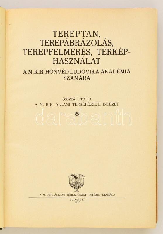 Tereptan, terepábrázolás, terepfelmérés, térképhasználat: A M. Kir. Honvéd Ludovika Akadémia számára. Összeállította: a M. Kir. Állami Térképészeti Intézet. Bp., 1936, M. Kir. Állami Térképészeti Intézet, 371 p. Kiadói aranyozott egészvászon-kötés, szakadozott papír védőborítóban, jó állapotban.