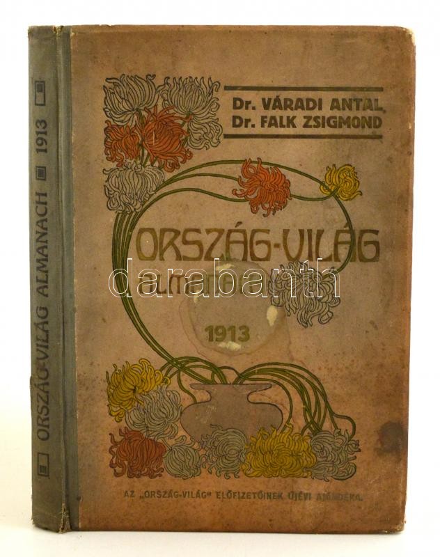 Ország-Világ almanach 1913. Az Ország-Világ szépirodalmi képes hetilap előfizetőinek újévi ajándéka. Szerk. Váradi Antal, Falk Zsigmond, Bp. 1913. Orsz. Irodalmi Rt., Szövegközti képekkel, reklámokkal gazdagon illusztrálva. Aranyozott, festett, díszes szecessziós kiadói félvászon kötésben.