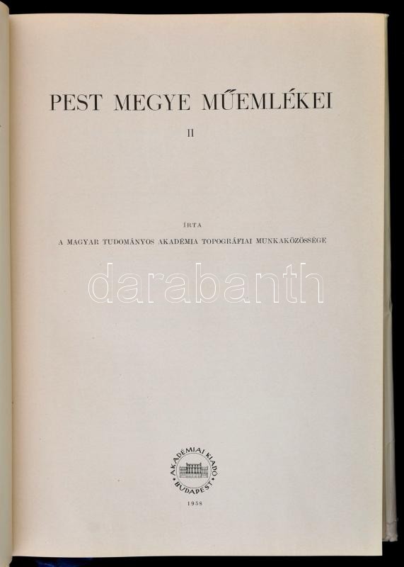 Pest megye műemlékei I-II. kötet. Magyarország Műemléki Topográfiája. ... https://www.darabanth.com/en/327-Online-auction/327.0/Books/Books-Travelling-Local-History~2500001/Pest-megye-muemlekei-I-II-kotet-Magyarorszag-Muemleki-Topografiaja-V-kotet-Bp-1958-~II1779861