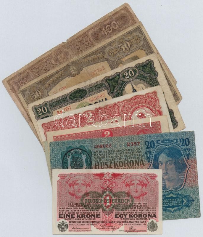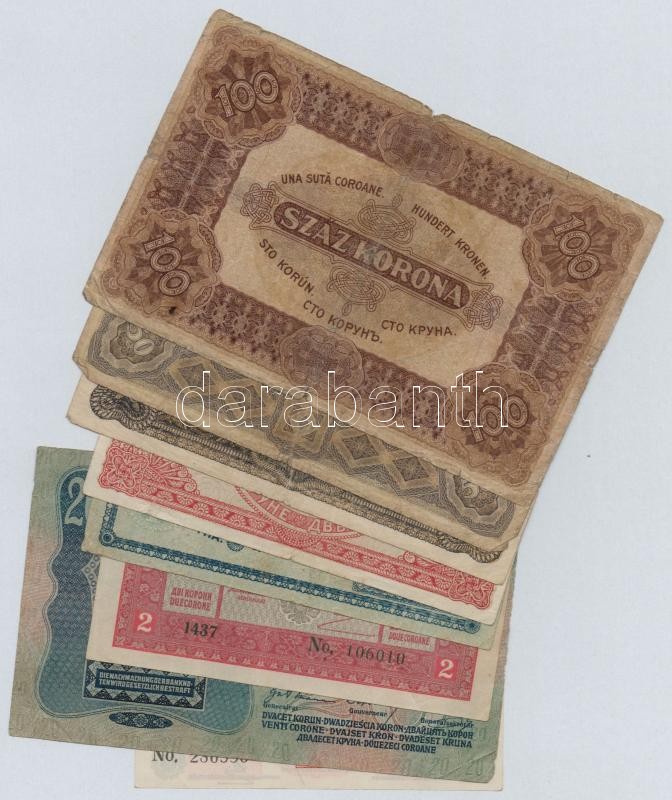 https://www.darabanth.com/en/327-Online-auction/327.0/Numismatics/Hungarian-Banknotes~2000007/Vegyes-8db-os-korona-tetel-kozte-1913-20K-fekete-ROMANIA-TIMBRU-SPECIAL-1920-2K-ab-sorozat~II1819603