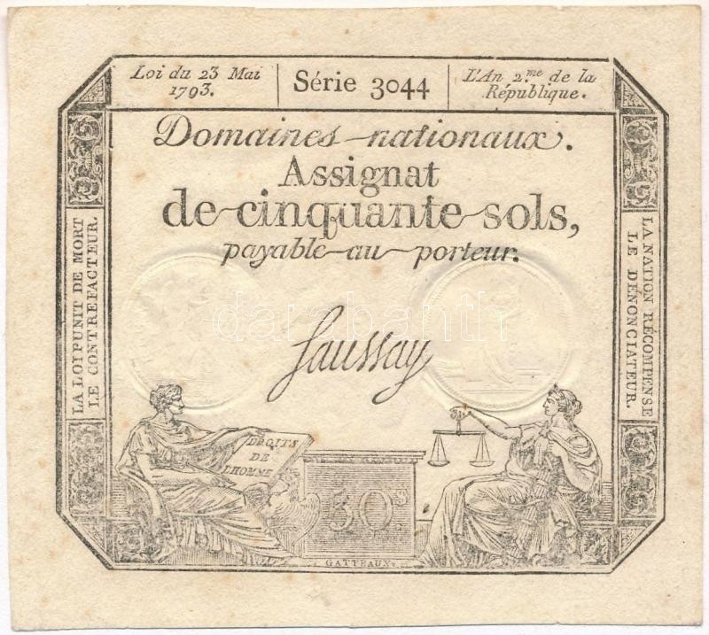 Franciaország 1793. 50s "Assignata" vízjellel és szárazpecsé... https://www.darabanth.com/en/327-Online-auction/327.0/Numismatics/Worldwide-banknotes~2000012/Franciaorszag-1793-50s-Assignata-vizjellel-es-szarazpecsettel-TI--France-1793-50-Sols-A~II1818873