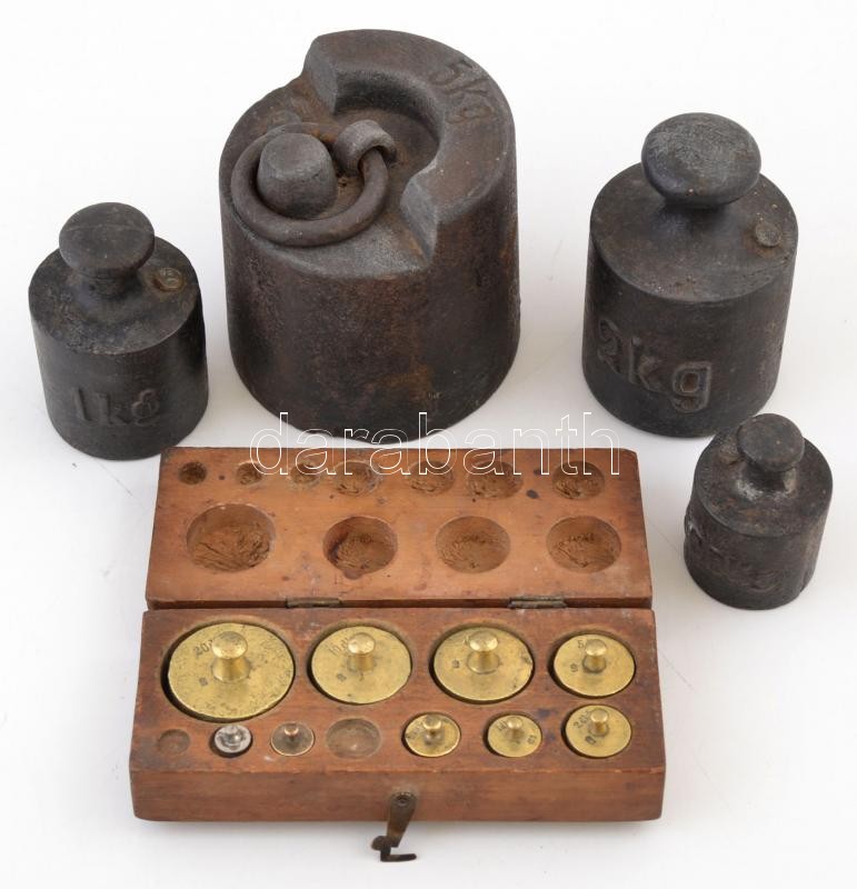 Súlykészlet, 9 db, (1 db 20 dkg, 2 db 10 dkg,1 db 5 dkg, 1 db 2 dkg, 2 db 1 dkg, 1 db 5 gr, 1 db 1 gr,) 2 hiánnyal, kissé sérült fa dobozban+ 1 db 5 kg, 1 db 2 kg, 1 db 1 kg, 1 db 50 dkg-os súlyok.