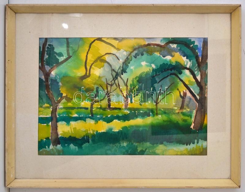 Jánossy Ferenc (1926-1983): Gyümölcsfák. Akvarell, papír, jelzett, üve...